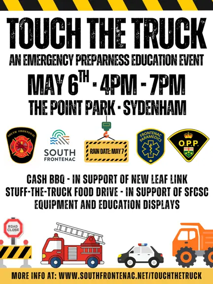 Aligning with Emergency Preparedness (EP) Week, which takes place the first full week of May, Touch the Truck features many activities focused on what families can do to plan for different emergencies. Of course, there are lots of big trucks and equipment to explore, with South Frontenac’s Public Services, South Frontenac Fire and Rescue, Frontenac OPP, and Frontenac Paramedics all participating in the event.